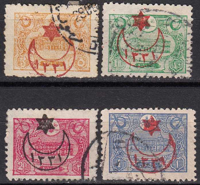 1915 SÜRŞARJLI HARB EMİSYONU PULLARI (1913 POSTAHANE RESİMLİ PULLAR ÜZERİNE) DAMGALI PARÇA PULLAR
