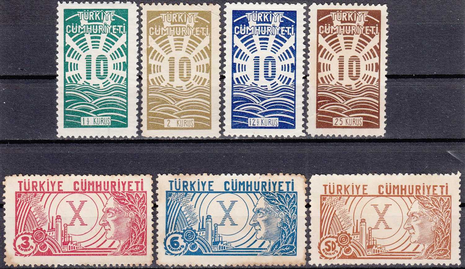 1933 CUMHURİYETİN ONUNCU YILDÖNÜMÜ HATIRA PULLARI DAMGASIZ TAM SERİ (3, 6, 25, 50 GOMSUZ, 1.5, 2 ZAMKLI, 12.5 MNH) KATALOG: 2.500 TL