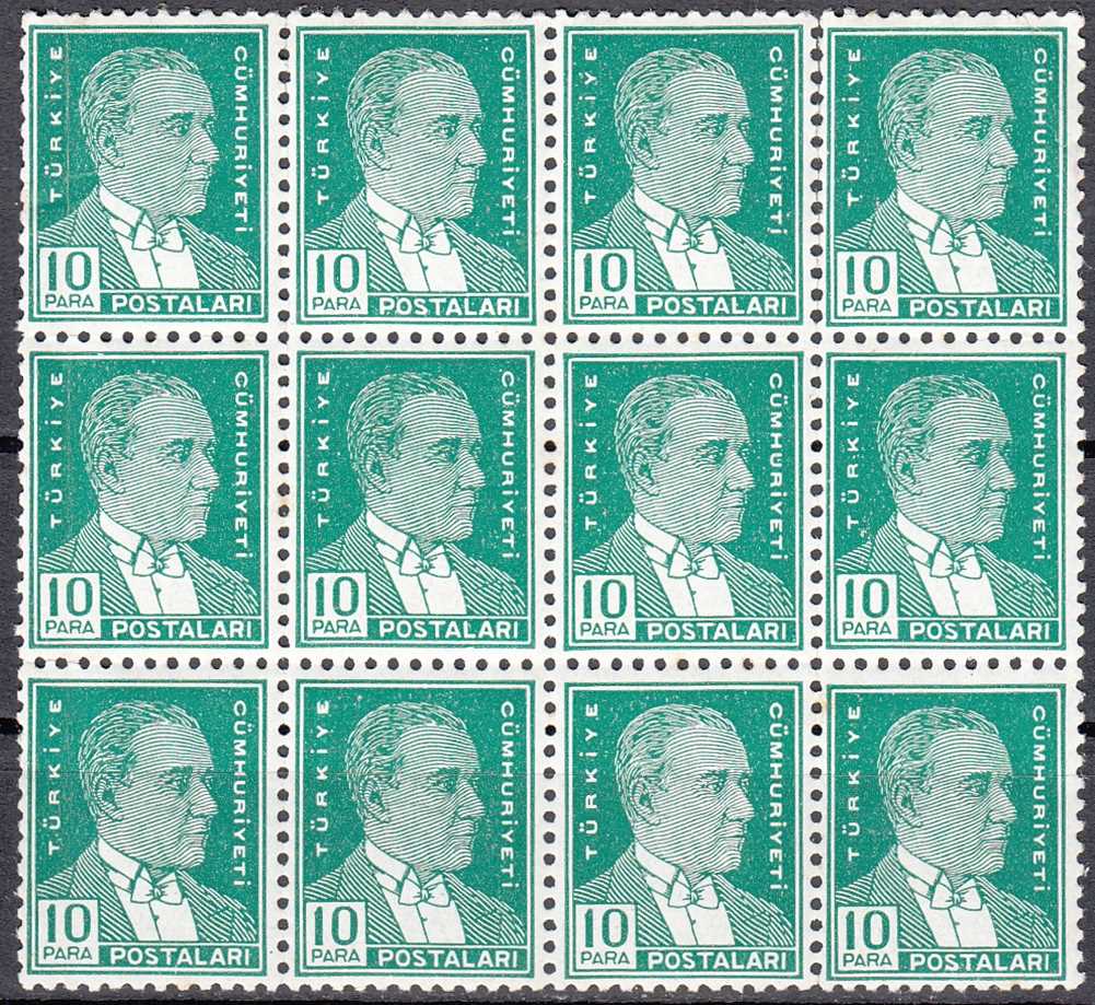 1933 İKİNCİ ATATÜRK SERİSİ 10 PARA DAMGASIZ ZAMKLI SARI LEKELİ 12 Lİ BLOK