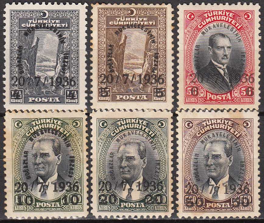 1936 BOĞAZLAR MUKAVELESİNİN İMZASI SÜRŞARJLI HATIRA PULLARI DAMGASIZ ZAMKLI SARI LEKELİ TAM SERİ KATALOG: 1.300 TL