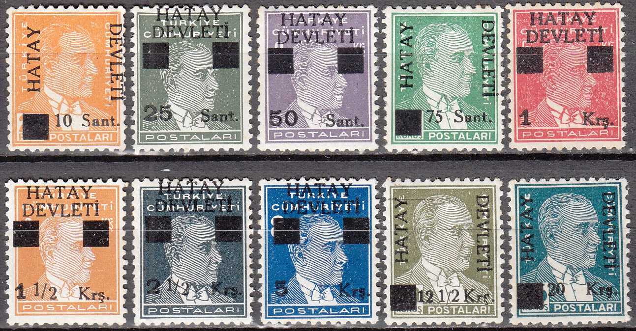 1939 TC ATATÜRK POSTA PULLARI ÜZERİNE HATAY DEVLETİ SÜRŞARJLI POSTA PULLARI (BİRİNCİ SERİ) DAMGASIZ ZAMK SARI TAM SERİ KATALOG: 600 TL