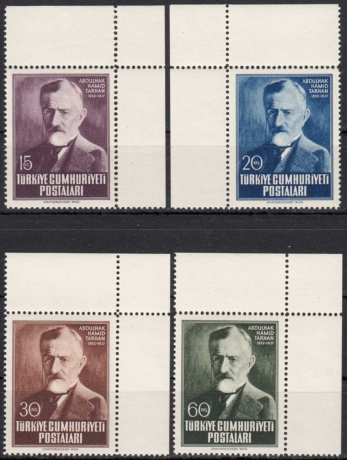 1952 ABDÜLHAK HAMİT TARHAN IN 100. DOĞUM YILDÖNÜMÜ KÖŞE PUL TAM SERİ MNH KATALOG: 275 TL