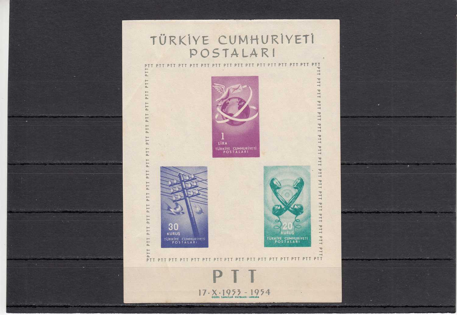 1954 PTT GENEL MÜDÜRLÜĞÜ YENİ KURULUŞ KANUNUNUN 1. YILDÖNÜMÜ HATIRA BLOKU DAMGASIZ ZAMKLI KATALOG: 800 TL
