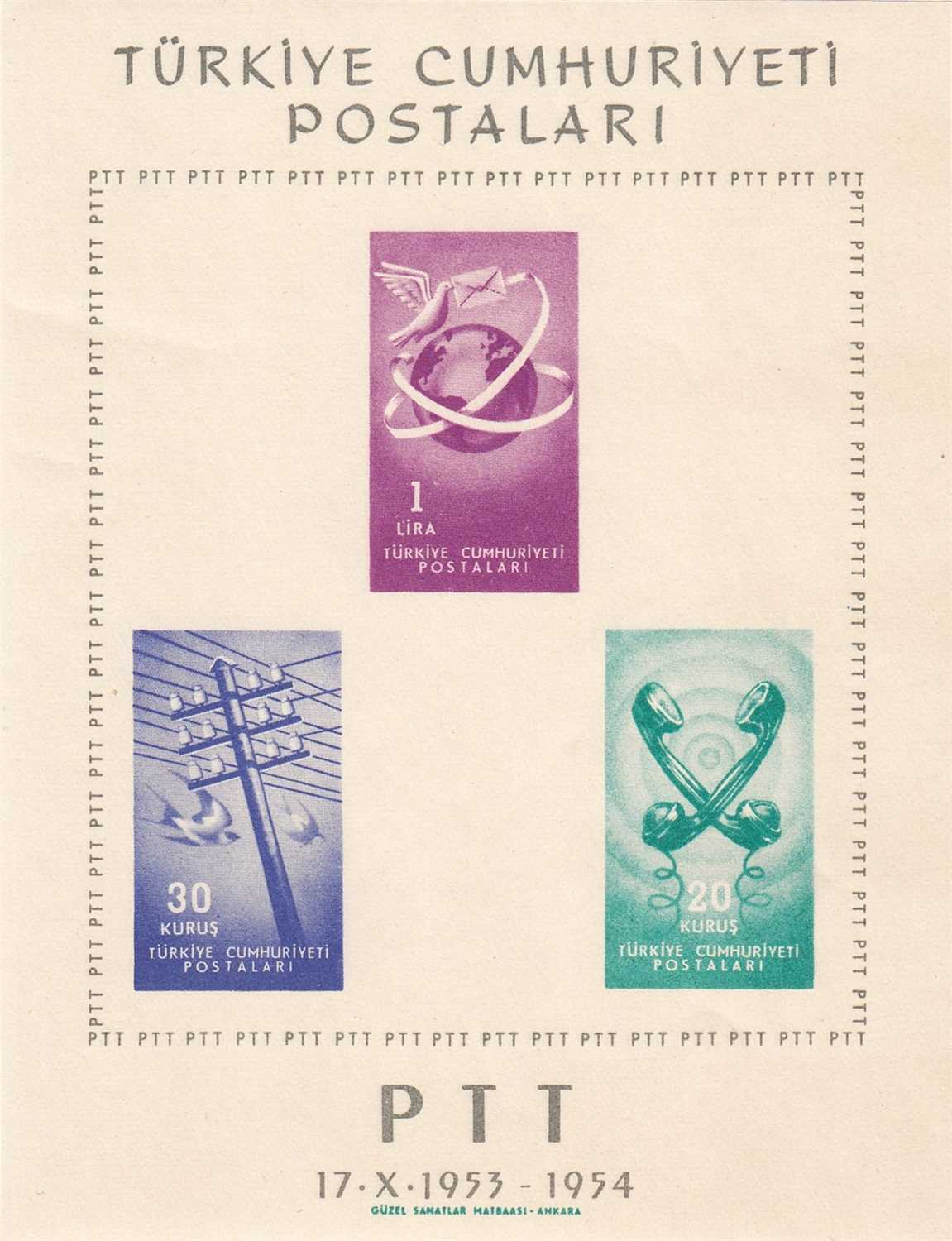 1954 PTT GENEL MÜDÜRLÜĞÜ YENİ KURULUŞ KANUNUNUN 1. YILDÖNÜMÜ HATIRA BLOKU MNH KATALOG: 800 TL