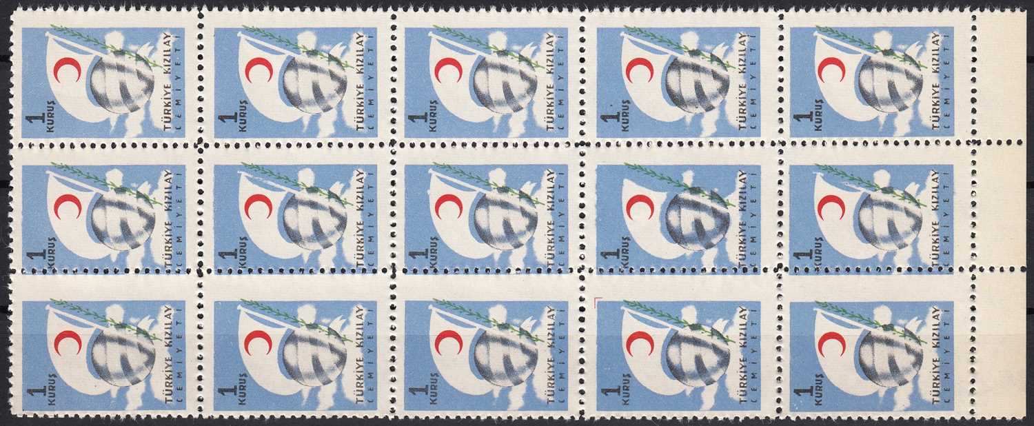 1954 TÜRKİYE KIZILAY DERNEĞİ ŞEFKAT PULLARI 1 KURUŞ K114 15 Lİ BLOK KAYIK BASKI ERÖR MNH