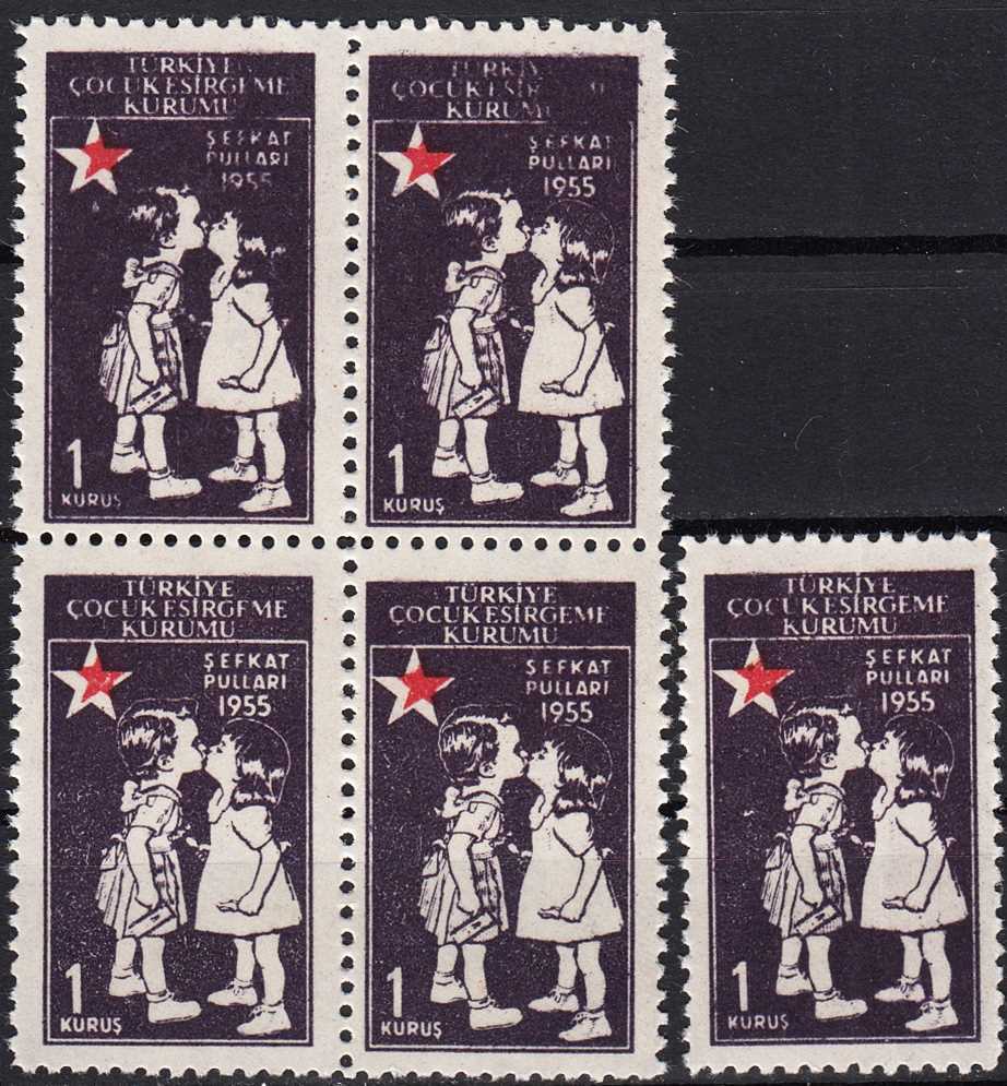 1955 TÜRKİYE ÇOCUK ESİRGEME KURUMU ŞEFKAT PULLARI 1 KURUŞ DBL VE TEK PUL MNH