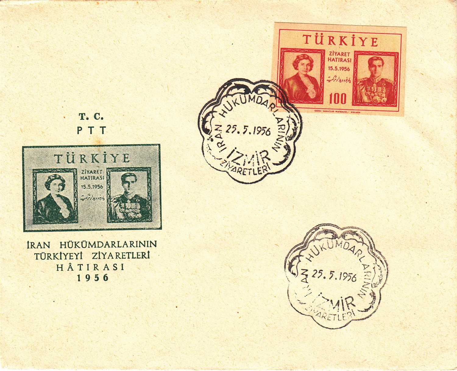 1956 İRAN HÜKÜMDARLARININ TÜRKİYEYİ ZİYARETLERİ İZMİR DAMGALI KIRMIZI 100 KURUŞ