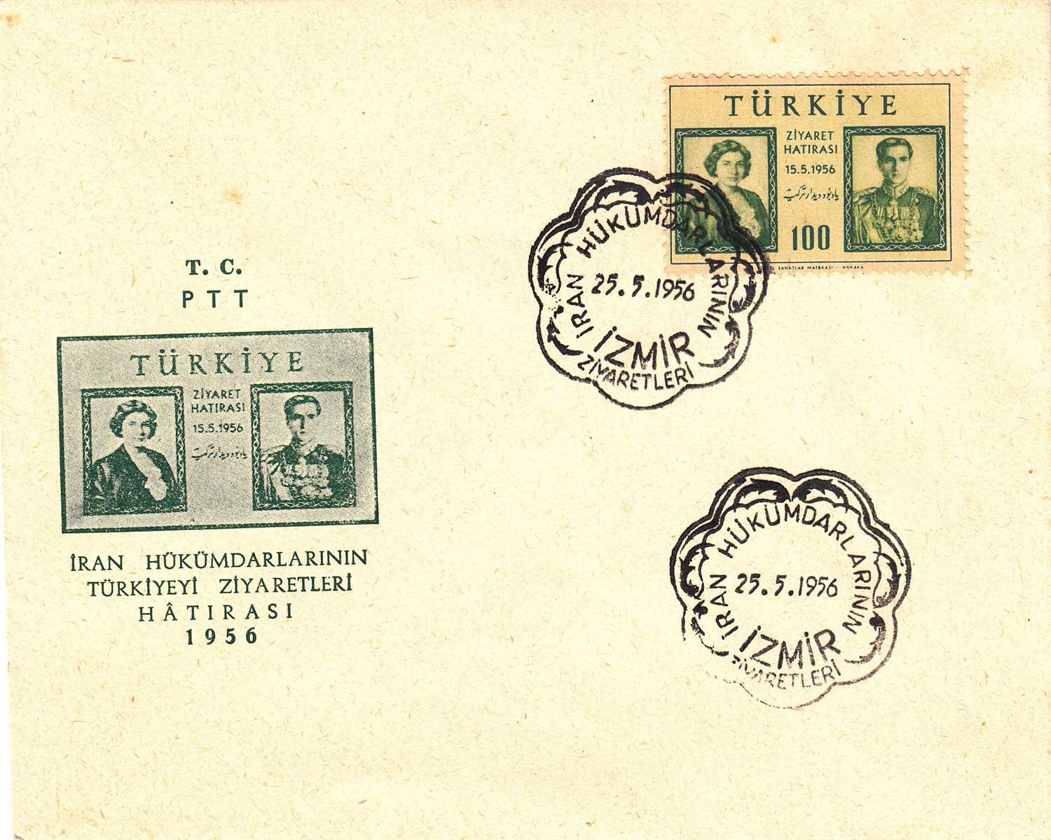 1956 İRAN HÜKÜMDARLARININ TÜRKİYEYİ ZİYARETLERİ İZMİR DAMGALI YEŞİL 100 KURUŞ