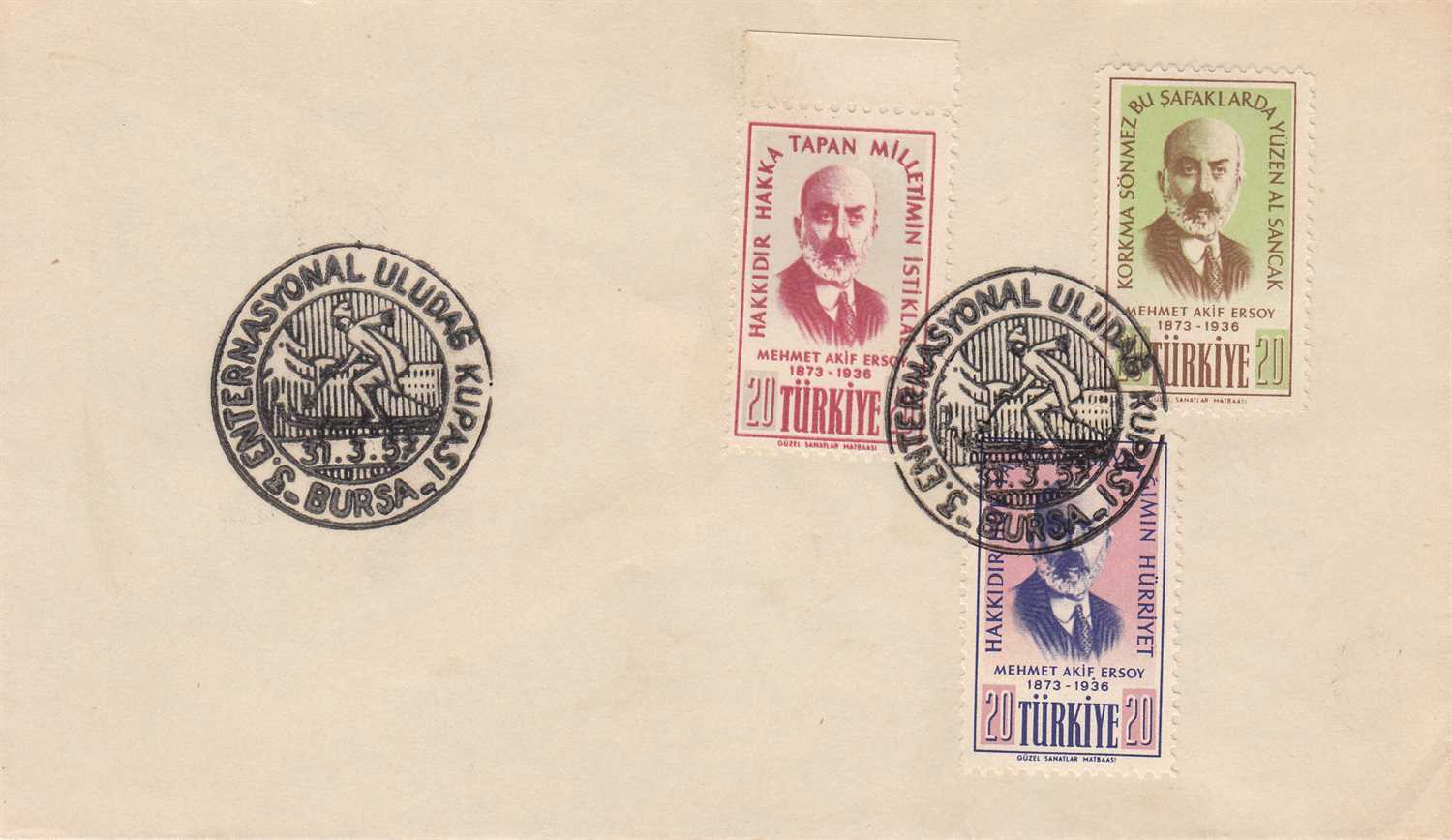 1957 3. ENTERNASYONAL ULUDAĞ KUPASI ÖZEL GÜN DAMGALI MEHMET AKİF ERSOY TAM SERİLİ FDC