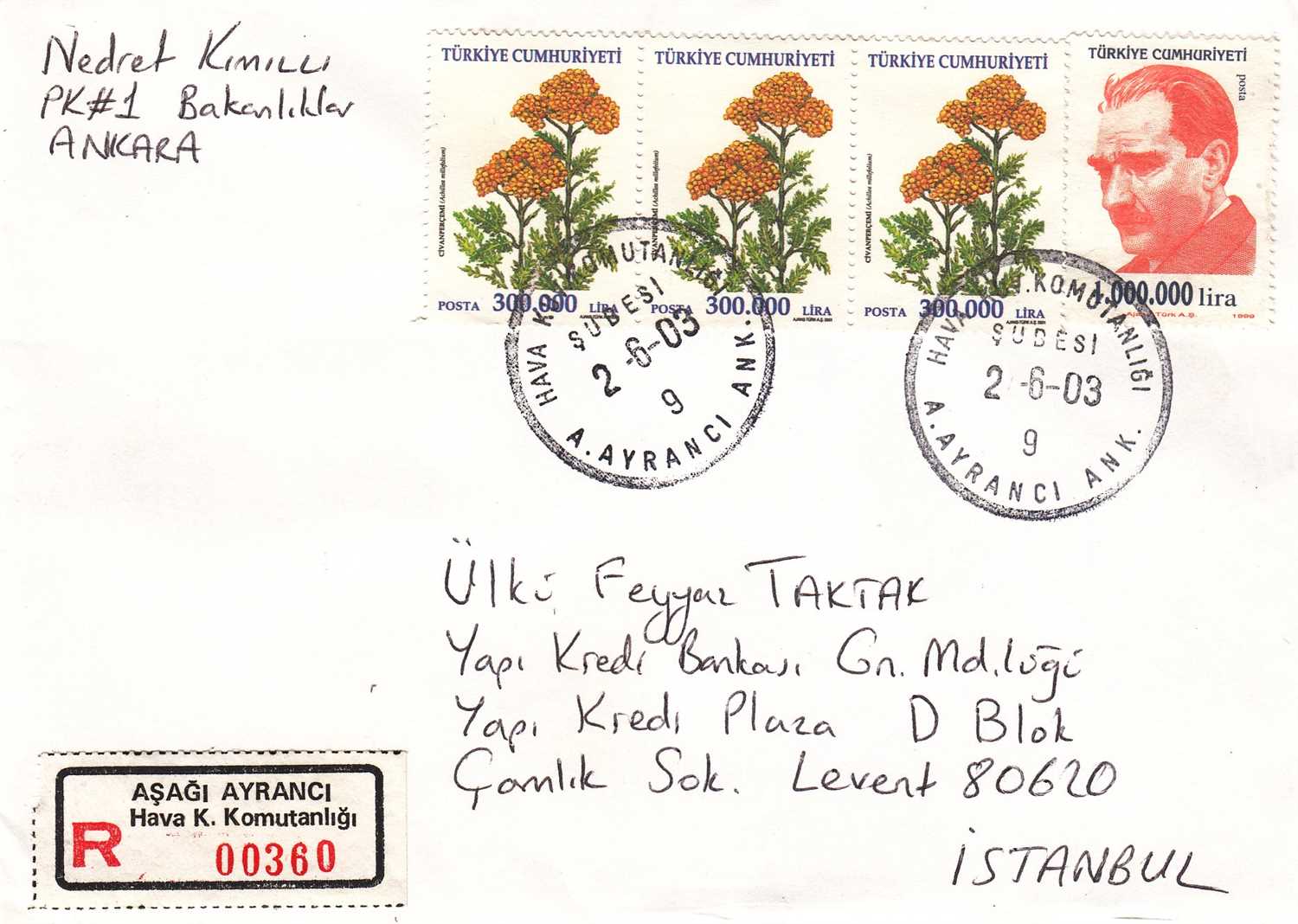 2003 AŞAĞI AYRANCI - LEVENT ARASI POSTADAN GEÇMİŞ ZARF