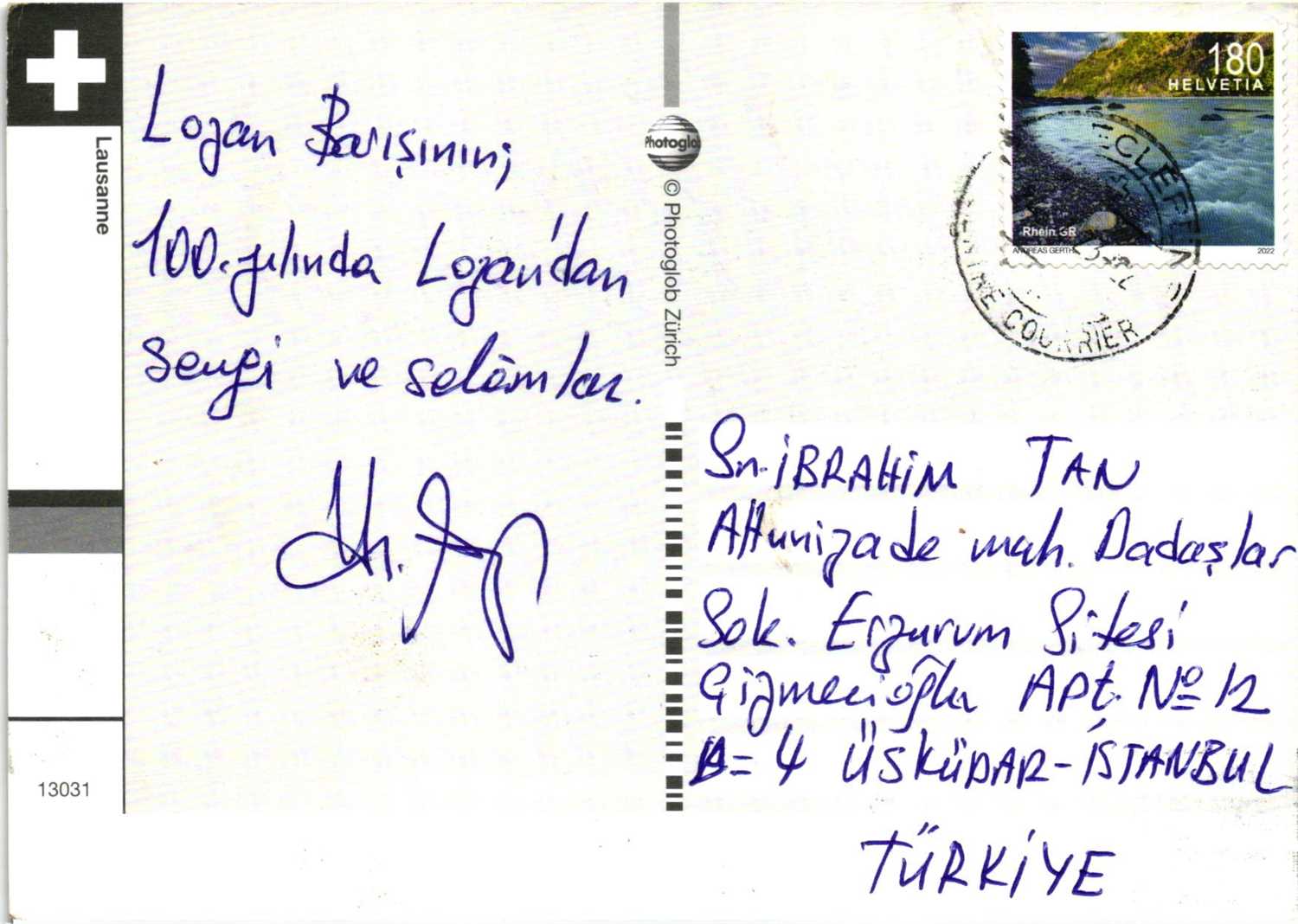 2022 İSVİÇRE 1.80 FRANK PULLU LOZAN BARIŞININ 100. YILINDA POSTADAN GEÇMİŞ KARTPOSTAL (100TL NOMİNAL)