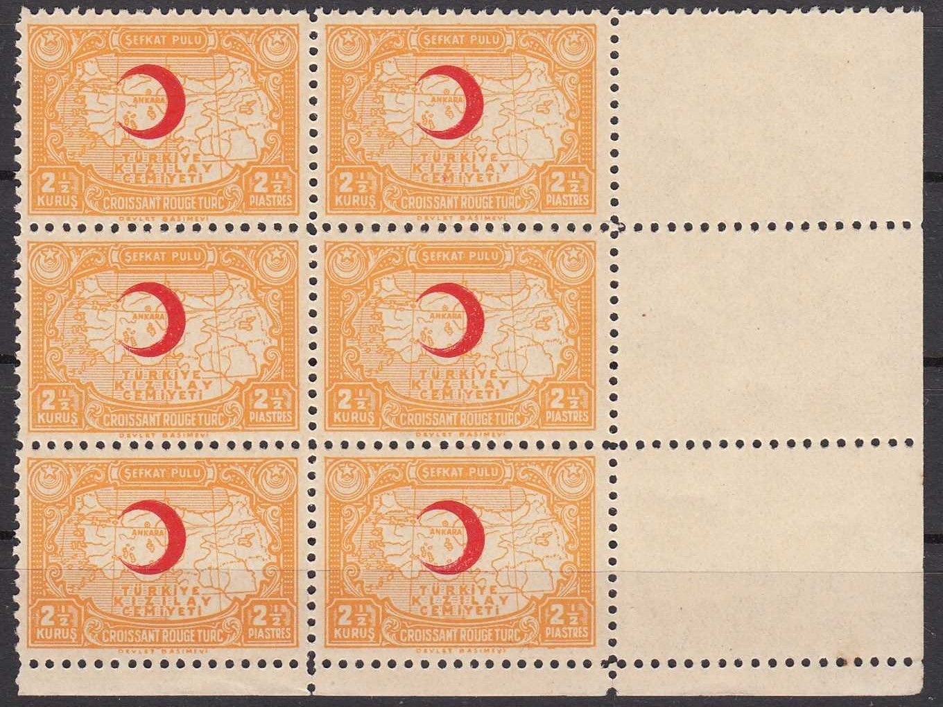 1937 - 1938 TÜRKİYE KIZILAY CEMİYETİ ŞEFKAT PULLARI K45 6 LI BLOK MNH KATALOG: 1.110 TL