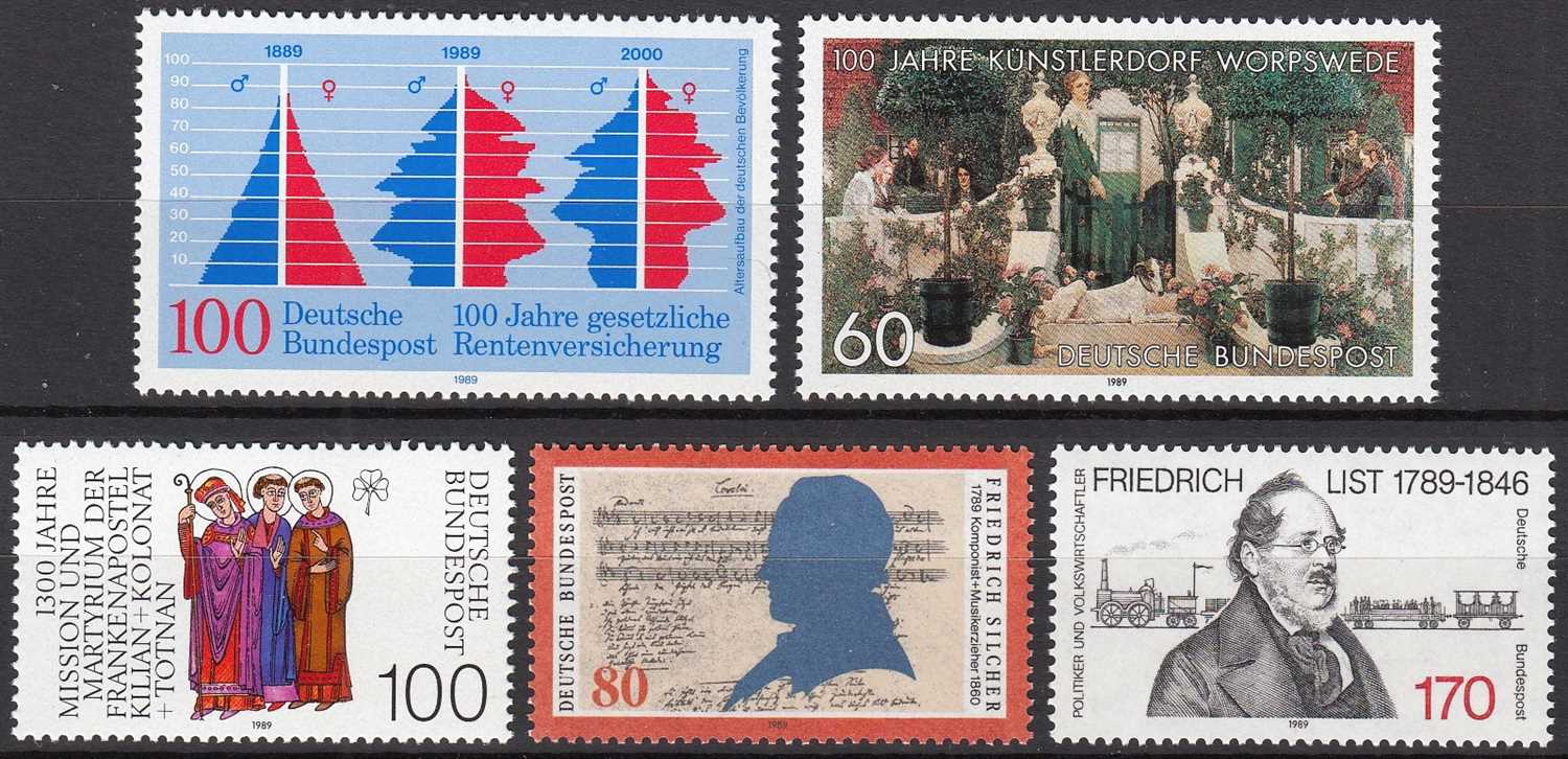 ALMANYA 1989 FRİEDRİCH LİST - SANATÇILAR ŞEHRİ - HAVAİ KİLİAN - BESTECİ FRİEDRİCH - ANNUİTY SİGORTASI 5 TAM SERİ MNH