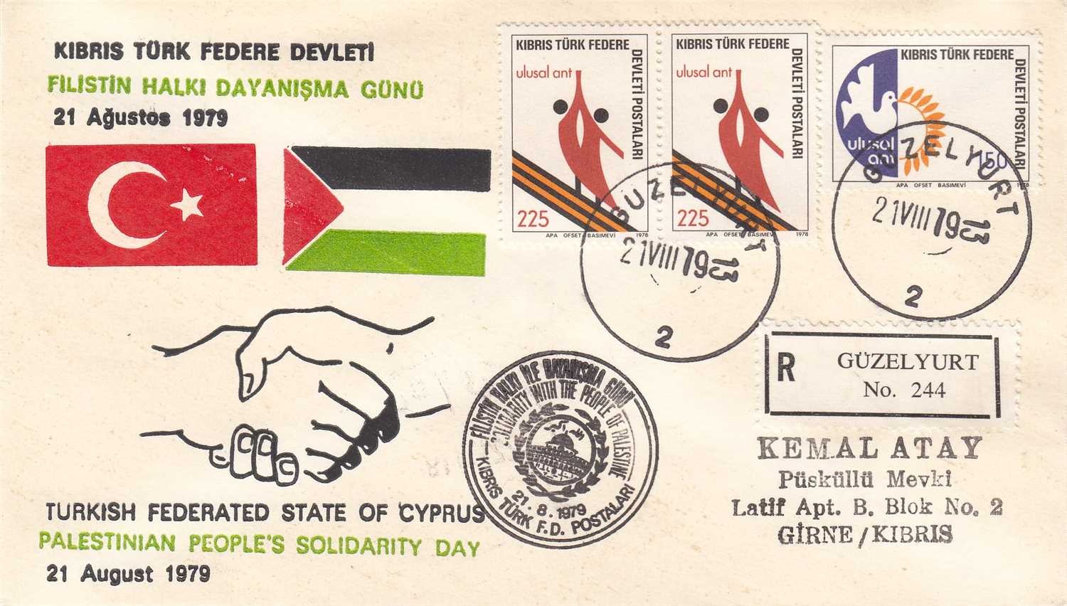 KKTC 1979 KIBRIS TÜRK FEDERE DEVLETİ FİLİSTİN HALKI DAYANIŞMA GÜNÜ POSTADAN GEÇMİŞ ZARF