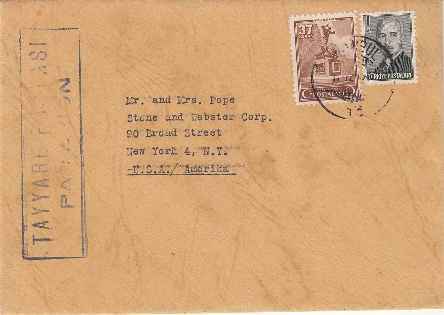 TAYYARE POSTASI AMERİKA - İSTANBUL POSTADAN GEÇMİŞ ZARF